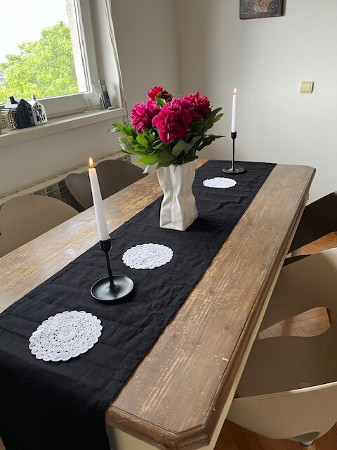 Crni pamučni raner sa heklanim rozetama je dekorativni raner za svečane prilike ali i za one svakodnevne. zbog svoje rustičnosti, dobro će izgledati u nekom šabi šik dekoru, ali i na elegantno postavljenom stolu.