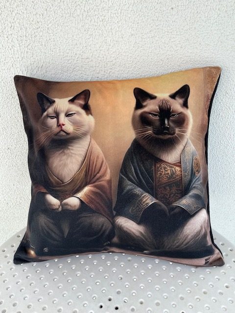 Dekorativni jastuk od pliša Mijau Sensei je jastuk sa zabavnim, fotorealističnim motivom mačaka u odori učitelja borilačkih veština. Zato sam ga i nazvala Mijau Sensei, jer izgledaju mudro, produhovljeno i pomalo opasno. Jastuk ima jedno lice i jastučnicu koja se može skidati radi održavanja.