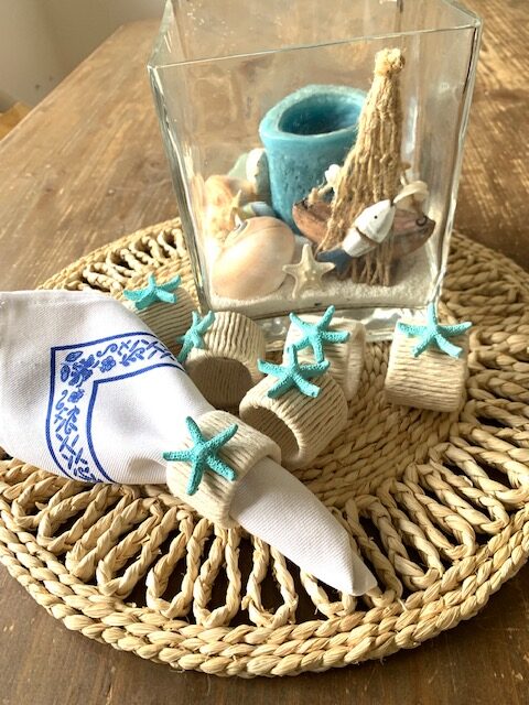 A da biste postigli svečani izgled stola, nekada je dovoljno da na tanjire postavite salvete sa dekorativnim prstenovima. Odlučite se za prstenove koji će pratiti izabranu temu. U ovom slučaju, nautički, morski stil dekoracije.