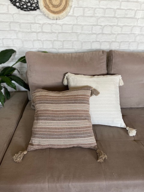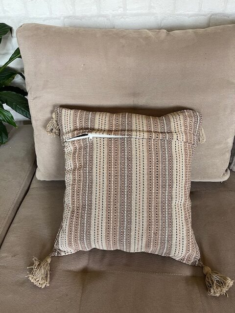 Jastuk lešnik braon pruge sa boho kićankama
