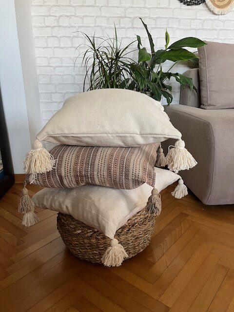 Jastuk lešnik braon pruge sa boho kićankama je dekorativni, tkani pamučni jastuk u toplim smedjim bojama lešnika. Uz dodatak bogatih pamučnih kićanki, je pravi boho, etno jastuk. A sa čvrstim punjenjem postaje jastuk za meditaciju ili joga jastuk za podršku pri asanama.