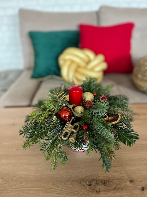 Ovaj ukras za centar stola je napravljen u klasičnoj kombinaciji crveno, zeleno, zlatno. Pošto se grančice četinara ubadaju u specijalni cvećarski sundjer, koji se natapa vodom, dugo ostaju sveže i mirisne.