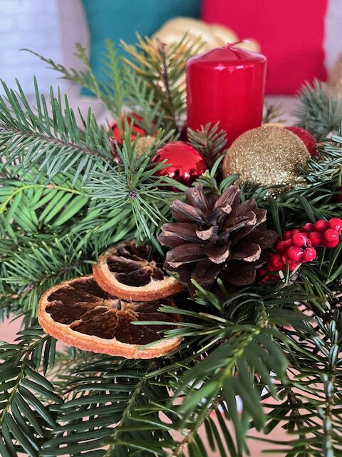 Izbor dekorativnih elemenata je stvar naše trenutne inspiracije, ali i vaših želja. Sve što biste voleli da vidite na svom novogodišnjem ukrasu, mi ćemo uklopiti u aranžman. Za ovaj klasični stil koristimo crvene i zlatne kuglice, prave šišarke. Tu su i kolutovi sušene pomorandže i štapići cimeta. Za vaše najmladje dodajemo zabavne figurice: Deda Mraza, šumskih patuljaka, jelena, sanki…