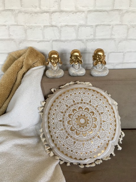 Veliki jastuk za sedenje na podu, izrađen od prirodnog pamuka u natur bež boji, predstavlja savršen spoj udobnosti, stila i praktičnosti. Sa svojim resama u boho stilu, ovaj jastuk dodaje notu topline i opuštenosti u svaki prostor. A zlatna mandala mu dodaje i malo glamura