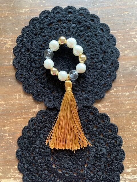 Materijal; Miks staklenih, sedefnih i zlatnih perli, zlatna kićanka.